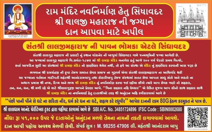 સંતશ્રી લાલજી મહારાજની જન્મભૂમીની જગ્યામા આખા લીમડામા એક ડાળ મંદિર સામે મીઠી છે એ પરચો હાલમાં મોજુદ છે લાલજી મહારાજે લીમડાનું દાતણ કરી અને દાતણની ચીર વાવેલ એ લીમડો હાલ મોજુદ છે આ સંસ્થાને ૨૦૪ વર્ષ થયાં છે.